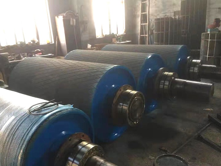 傳動滾筒是輸送機傳遞動力的部件。傳動滾筒表面有裸露光鋼面,人字形和菱形花紋橡膠覆面。小功率、小帶寬及環境干燥時可采用裸露光鋼面。人字形花紋膠面摩擦系數大,防滑性和排水性好,但有方向性。菱形膠面用于雙向運行的輸送機。